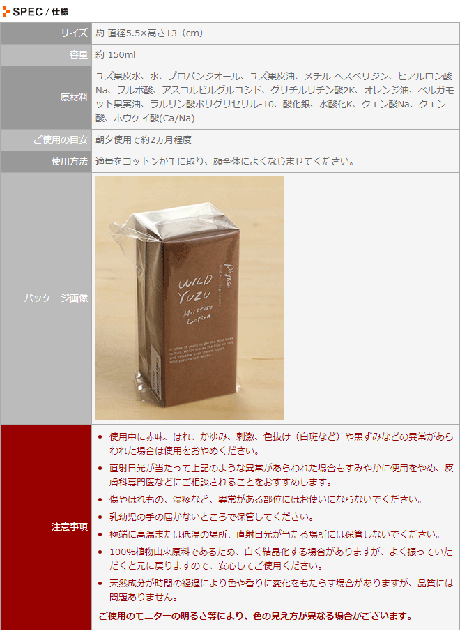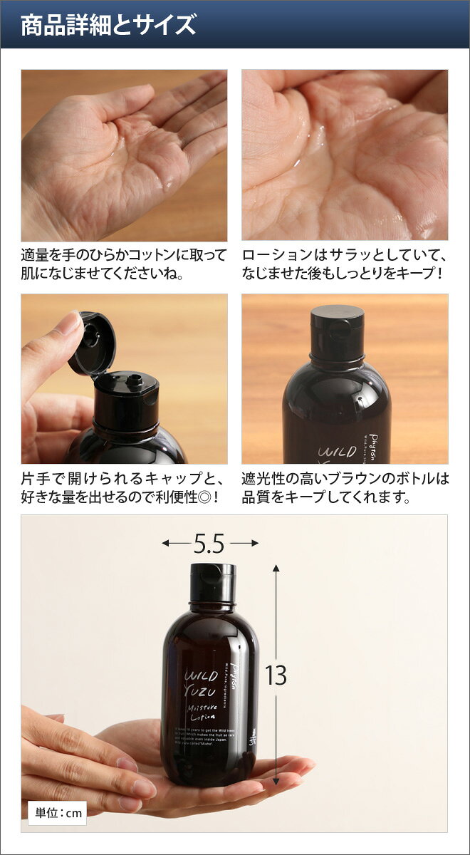 WILD YUZUモイスチャーローションの特徴 【1】ゆずに含まれるビタミンCや保湿成分で健やかな肌へ 【2】敏感なお肌にも嬉しい植物由来成分100% 【3】爽やかな香りでリフレッシュ こちらのシリーズで使われている実生ゆずは、すべて熱を加えながら水蒸気蒸留法で成分をじっくり抽出しているため、光毒性の心配はなし。